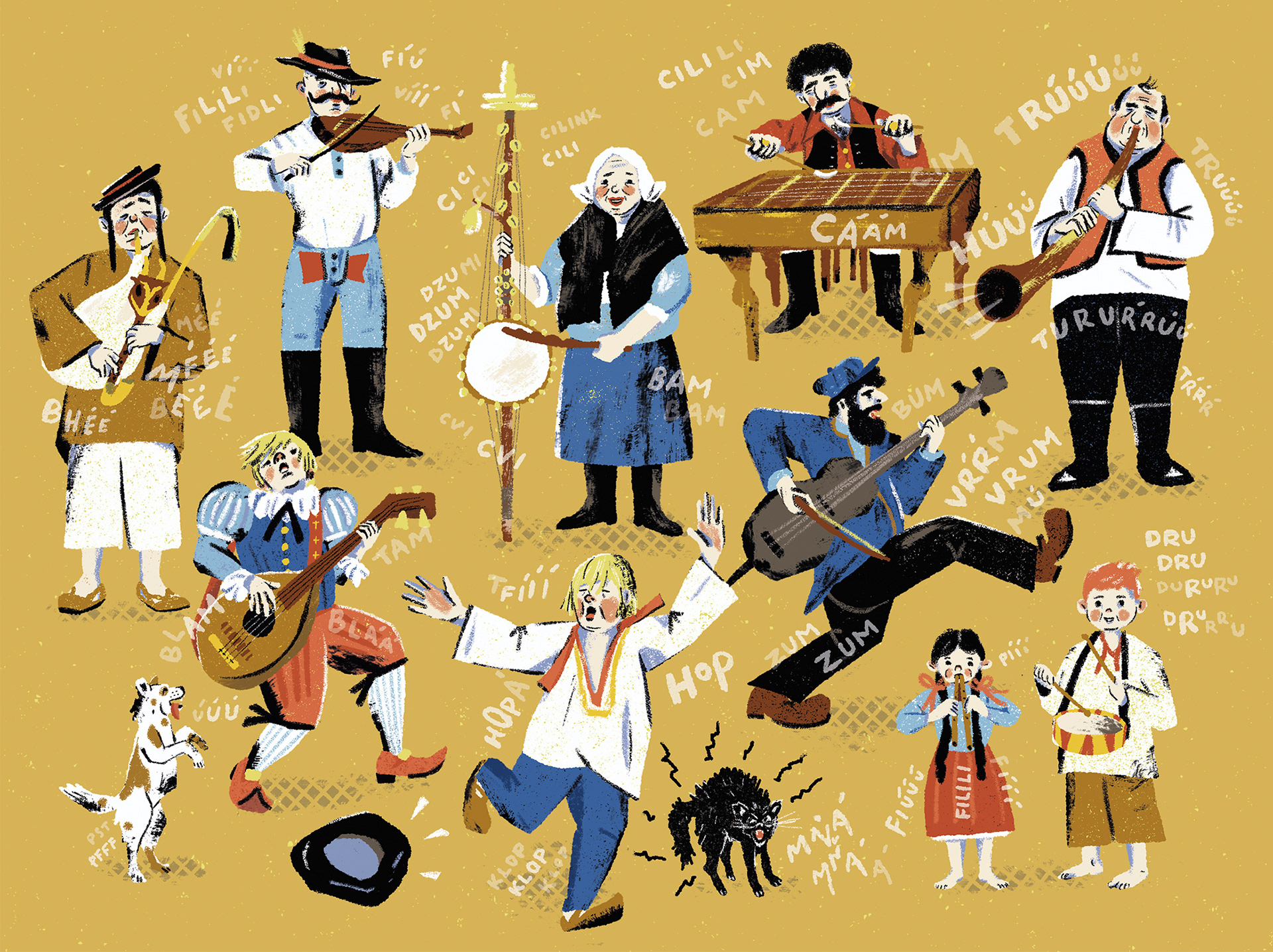 What would folklore be without music? This illustration showcases all kinds of traditional musical instruments.