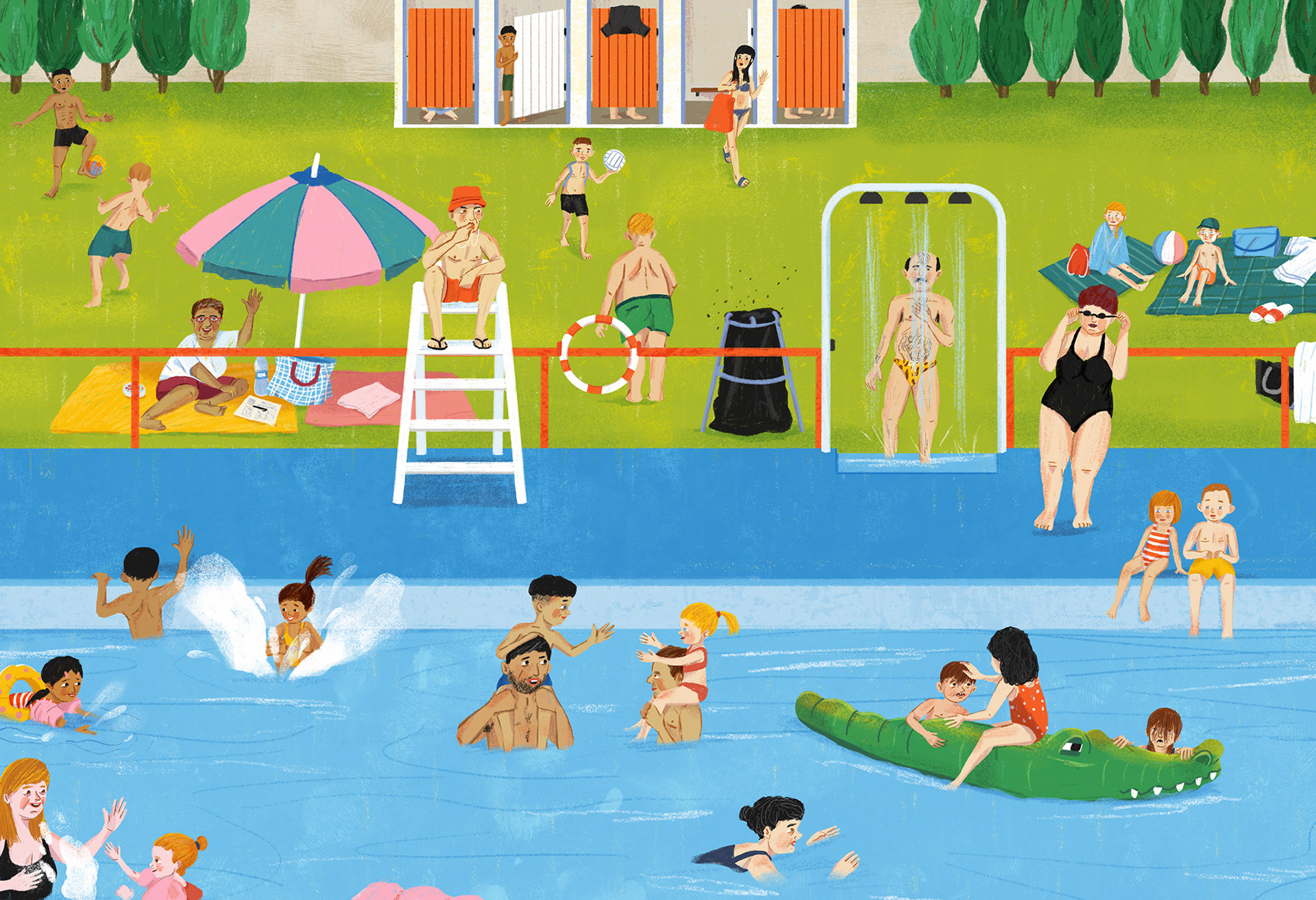 “There are lots of people! Some I know from my neighborhood. The boys are jumping into the pool, the older kids are talking and laughing, and it’s always a fun day at the pool.”