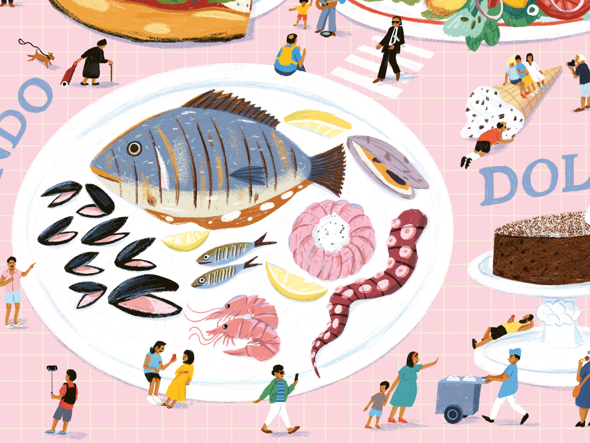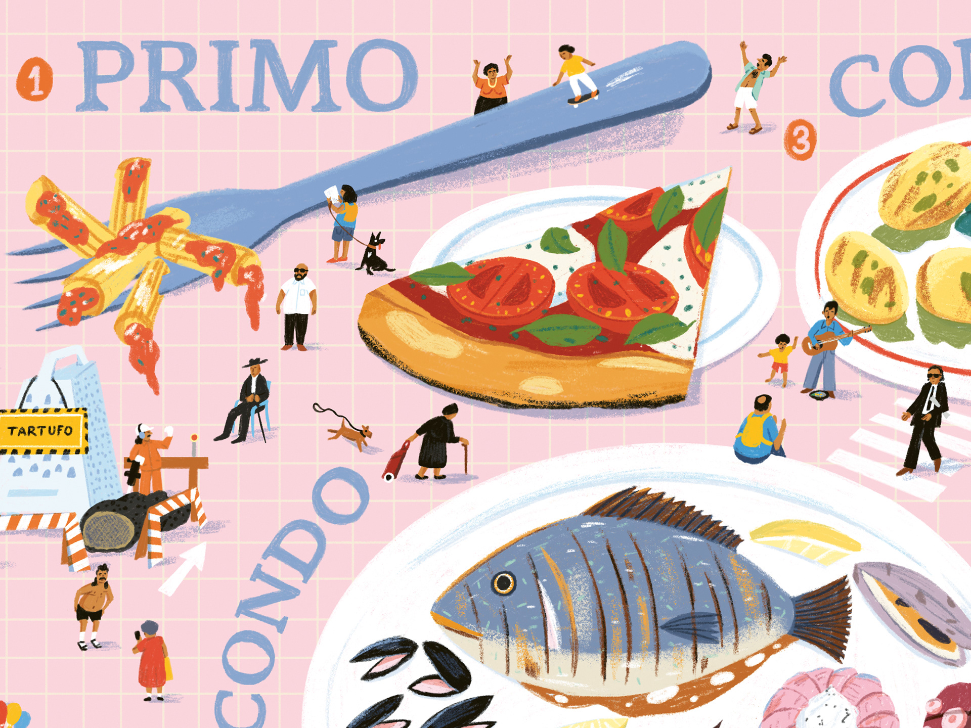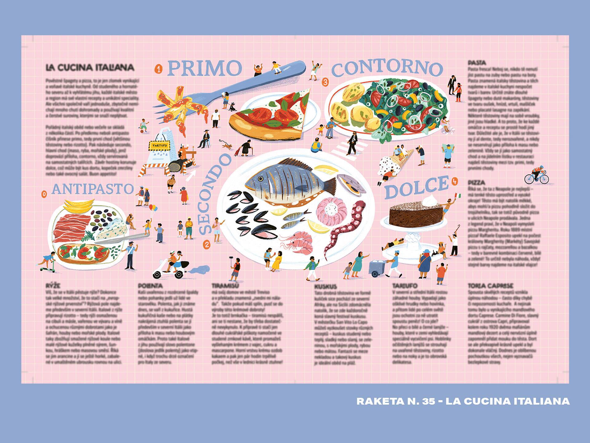 An illustration for children magazine Raketa for an article about Italian cuisine and its dishes.