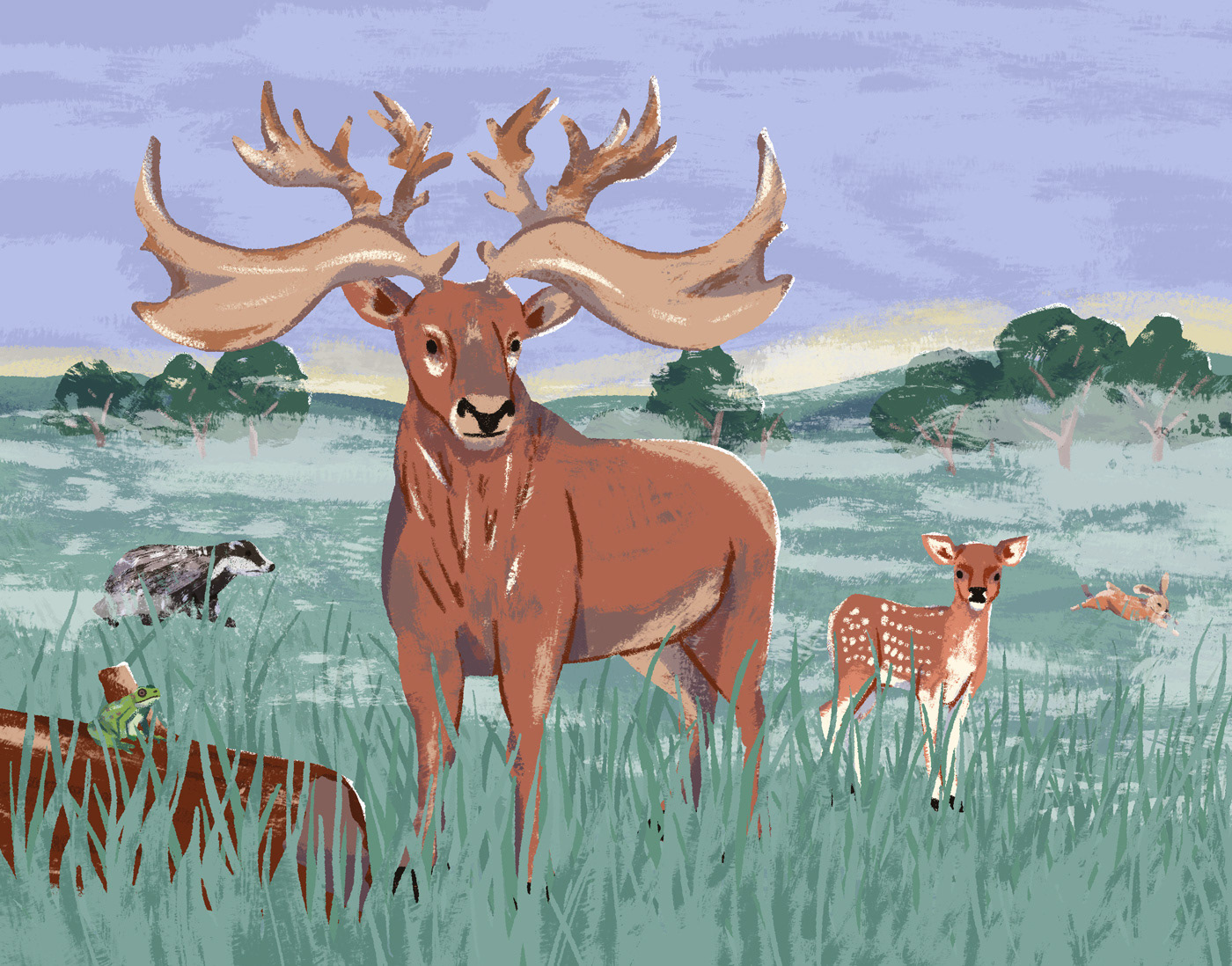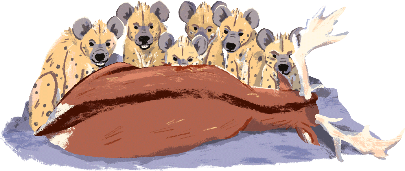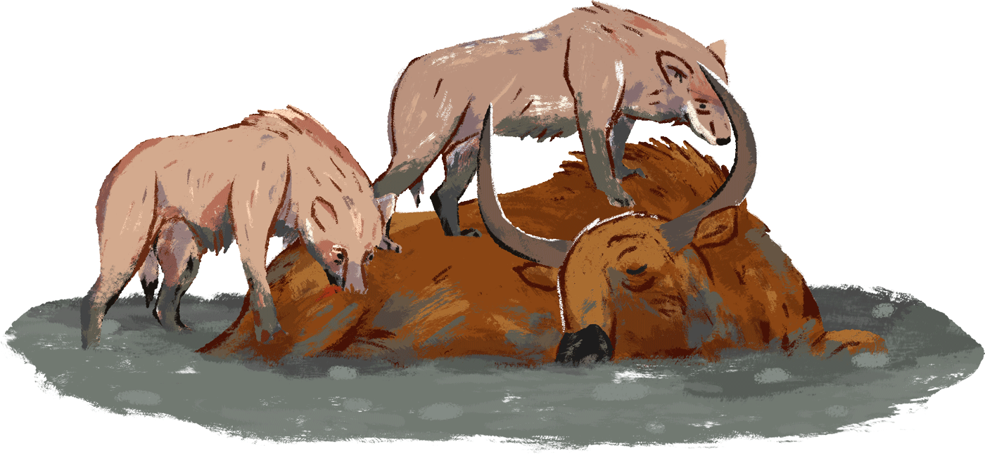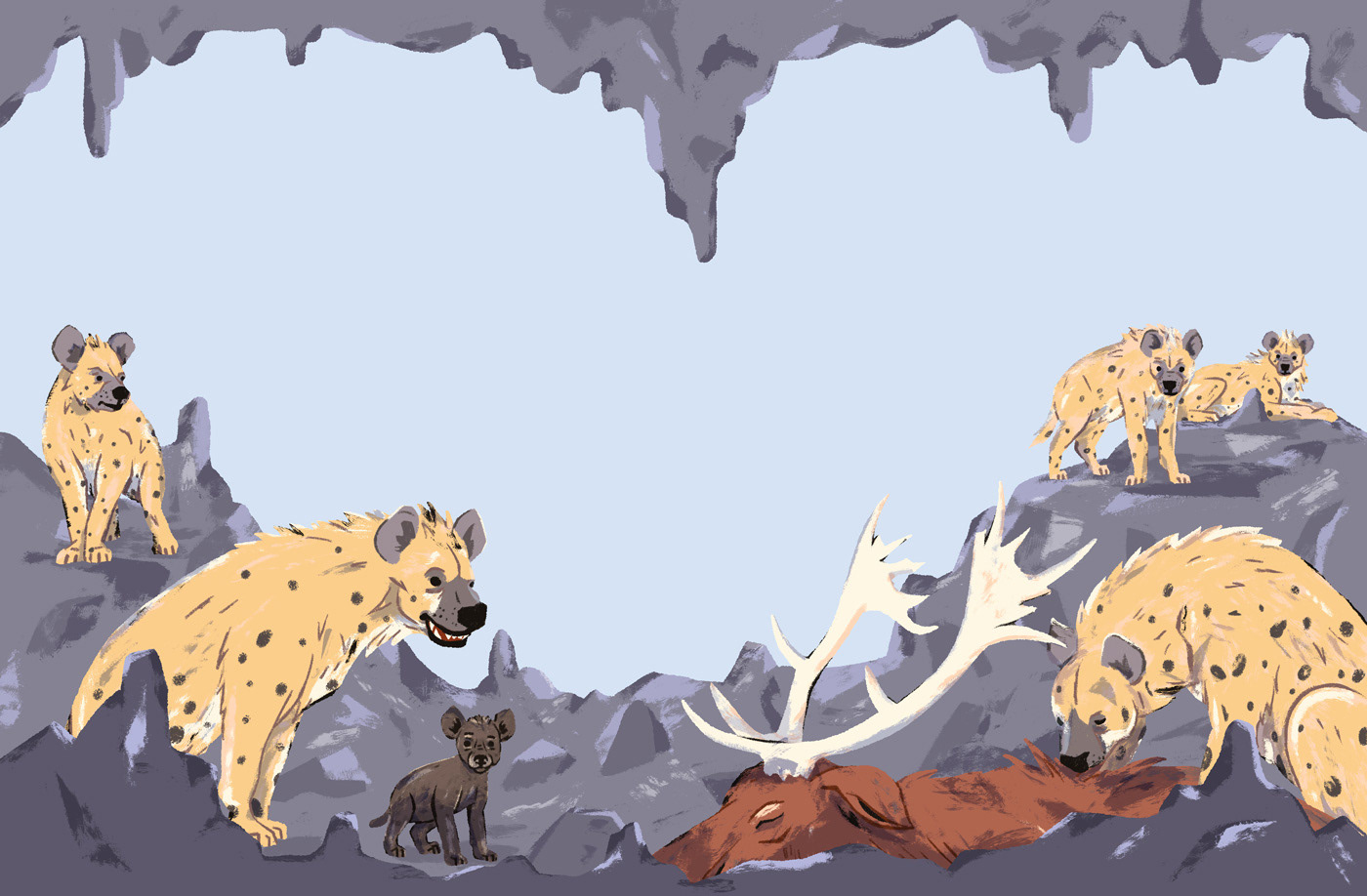 Big illustration of cave hyenas feeding on a dead deer. Surrounding space is reserved for text.
