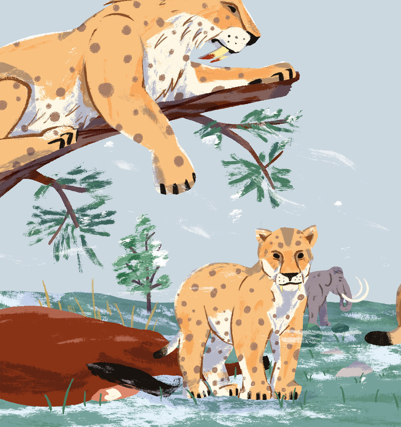 An illustration of a young Smilodon, better known as the saber-toothed tiger, being taught to hunt.