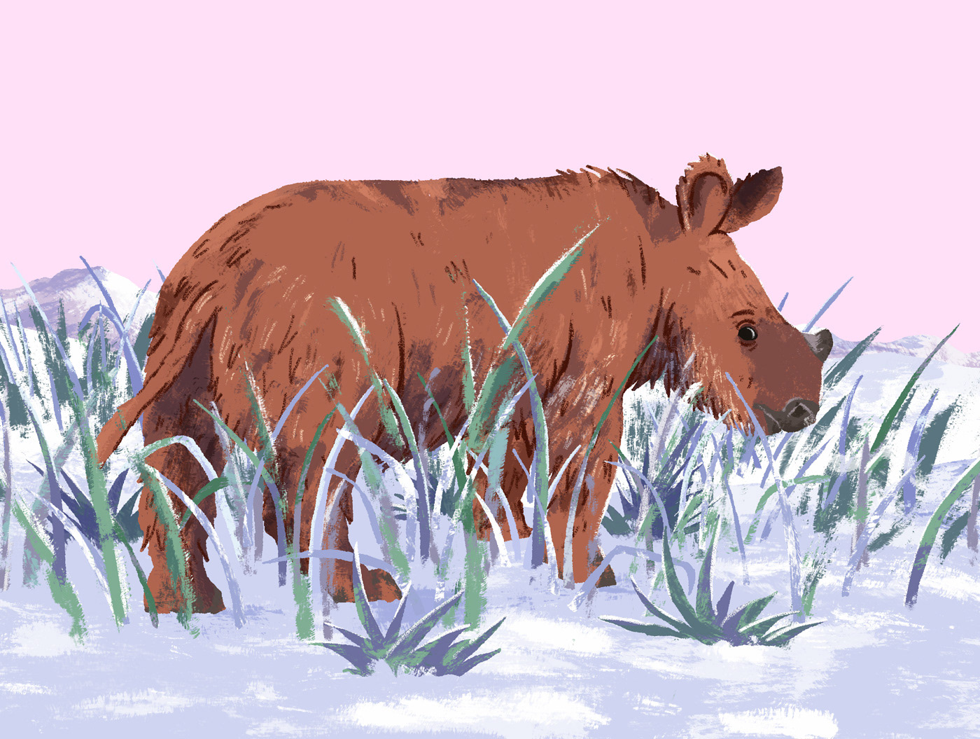 A young woolly rhinoceros roaming the frozen tundra in search of food.